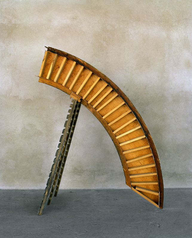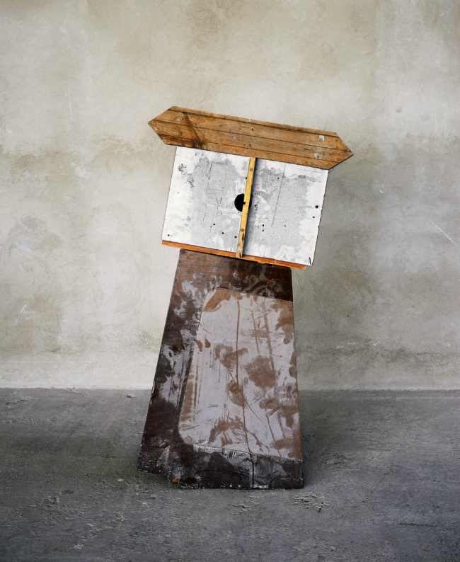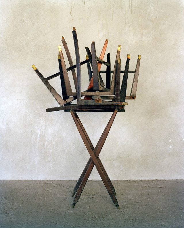 A tension is brought out by the sculptures’ vulnerability. Inches from collapse, each one is seen a beat before a leg gives out or a stool topples over. The photographs reveal, like ones that can still the folds of a windswept curtain, time’s physical bearing — only these look backward. It’s the second before that you look, the moment when not moving comes closest to resembling permanence.