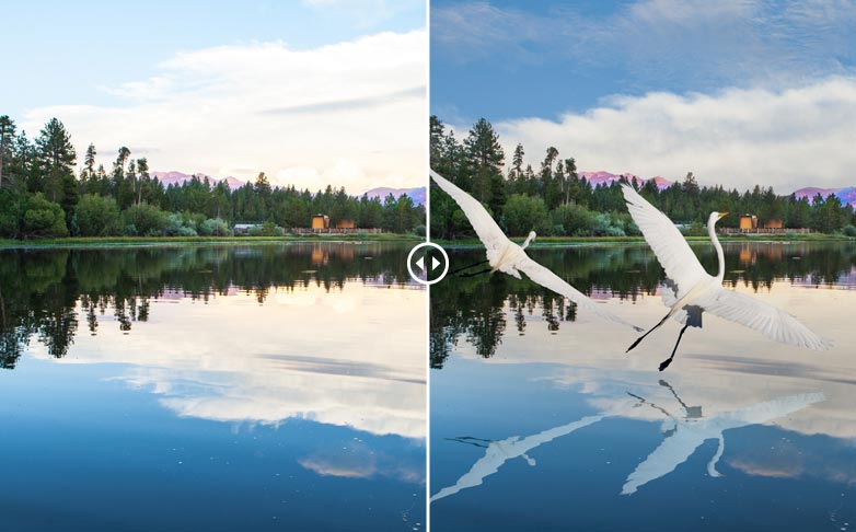 In a click, add clouds to boring skies, light up a night sky with the moon & stars. Finally catch that rainbow you always seem to miss in your camera. Add that impact of lighting or the calming effect of a flock of geese.