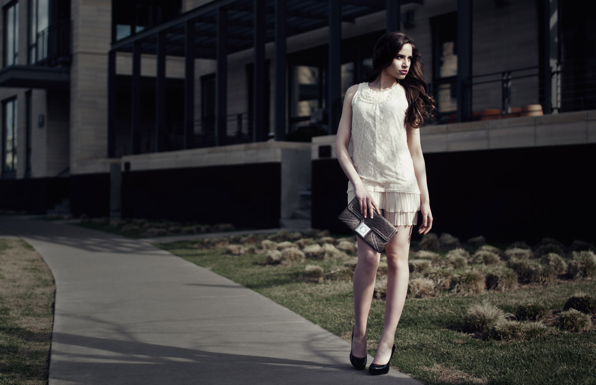 While on location, I shoot pretty much only natural light with a reflector here and there. Once in the general area that we will be shooting, we really just walk around until we find something that catches our eye, be it a really nice building, nice light. With natural light, I do have to be very picky about where I shoot. I use some pretty standard techniques while shooting natural light, which can restrict the areas I can shoot in, based on the type of light that I am looking for. Once I choose the particular place I want to shoot, I usually take a few setup shots to get the light and exposure correct, and then I will let the models do their thing, with direction if needed.